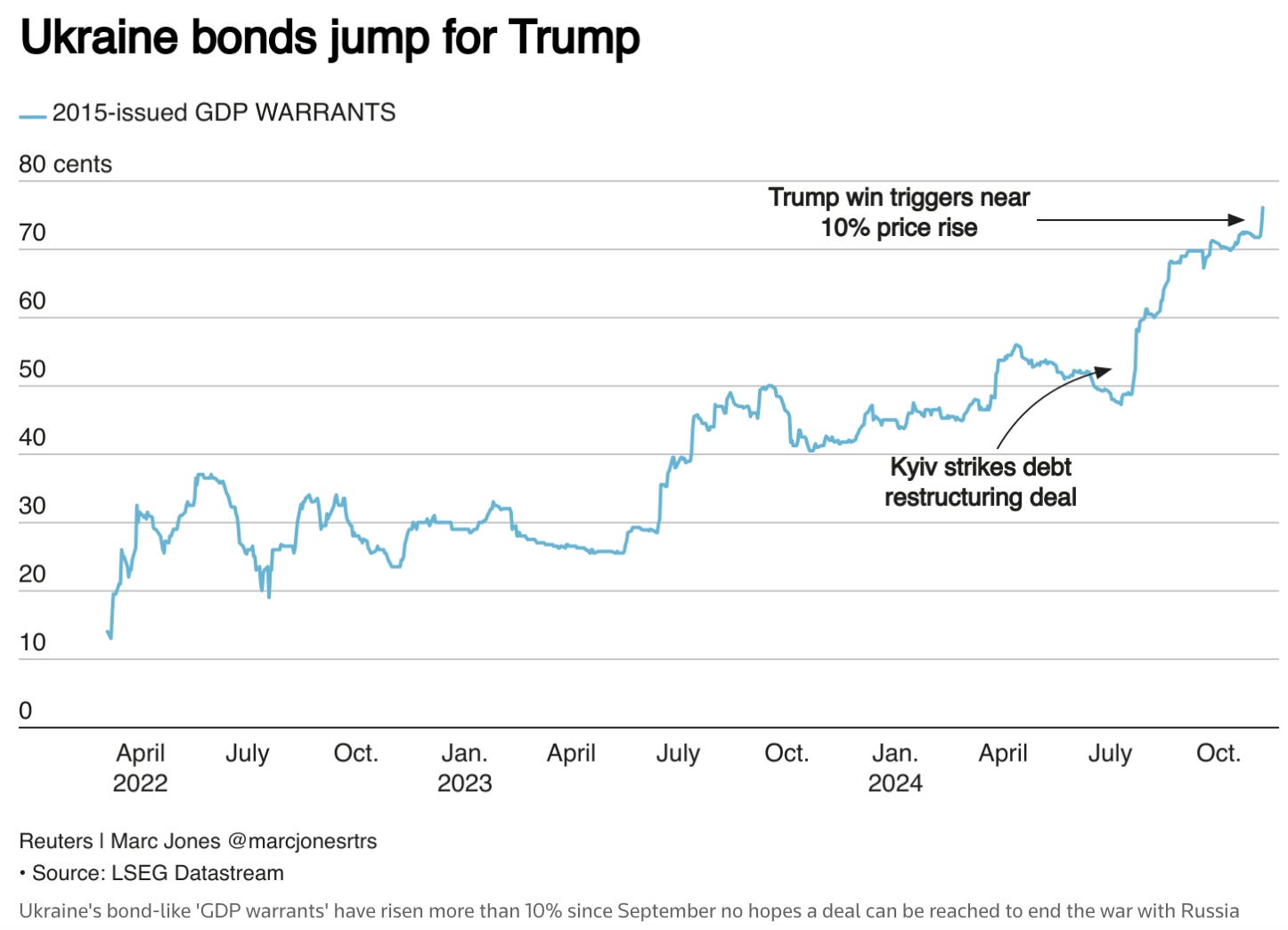 Ukraine's sovereign dollar bonds and GDP warrants extended a post-U.S. election rally on Thursday on optimism that Donald Trump's return to the White House could end the country's war with Russia.