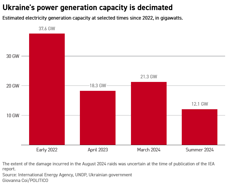“Russian drone and missile strikes against Ukrainian energy infrastructure in Summer 2024 reportedly significantly impacted Ukrainian electrical generation capacity compared to March 2024, though it is unclear whether Russia had been able to inflict significant further damage on the Ukrainian energy grid since.”