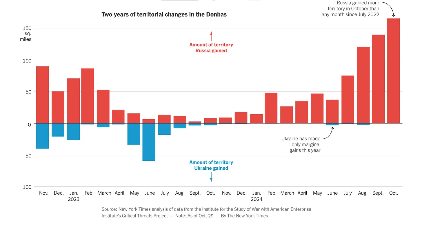 Russia’s territorial conquest has increased over the last few months, with Russia gaining more territory in October than any month since July 2022.