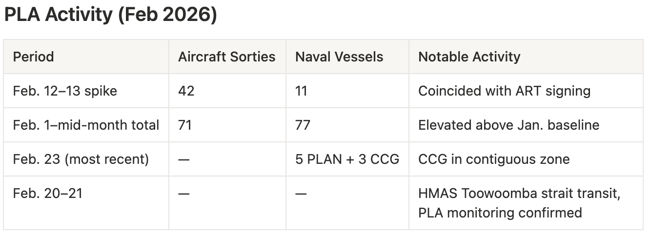 PLA pressure through February has been measurable and documented. Taiwan’s MND tracked 71 aircraft sorties and 77 naval vessels through mid-February, with a notable spike on February 12–13 — 42 aircraft sorties and 11 naval vessels detected in a concentrated activity window that coincided with the ART signing. As of February 23: 5 PLAN vessels and 3 Chinese coast guard ships operating in proximity to Taiwan. MND continues to report daily coast guard incursions within the contiguous zone, with Chinese official ships establishing persistent presence in the 12-nautical-mile buffer as standard operating procedure rather than escalatory signaling [HIGH confidence — MND daily release data].