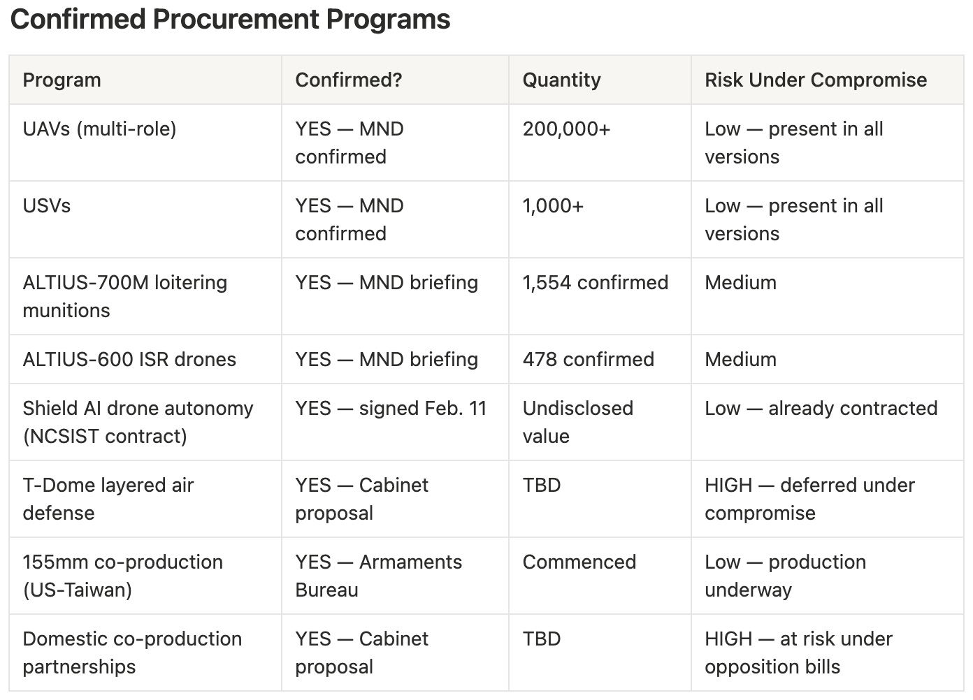 The most concrete procurement action in February: Shield AI signed a contract with NCSIST on February 11 for AI-driven drone autonomy integration — a named vendor, confirmed deal, and the clearest signal yet that Taiwan’s drone industrial strategy is advancing at the prime contractor level regardless of the special budget’s legislative status.