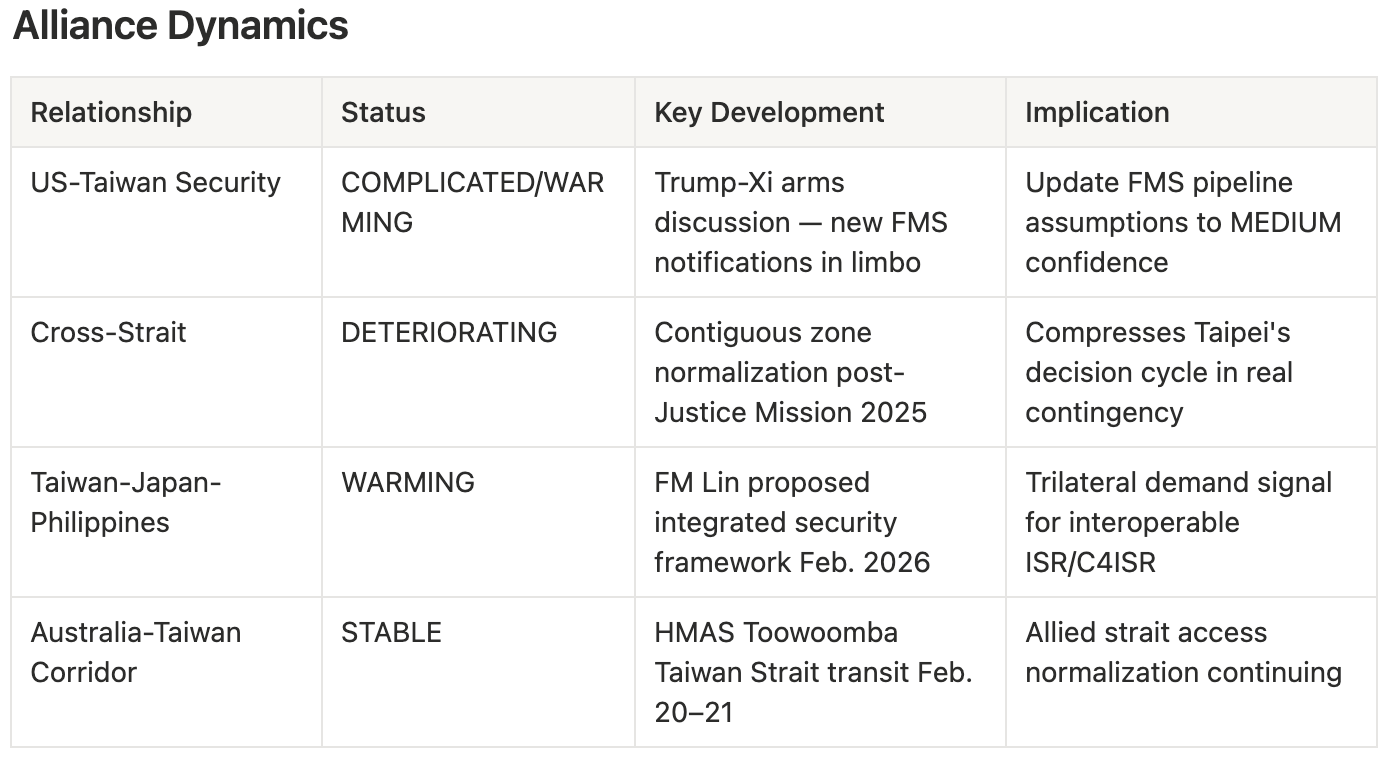Foreign Minister Lin Chia-lung proposed a Taiwan-Japan-Philippines integrated security framework in February — a notable diplomatic initiative at a moment when all three face direct PLA pressure. The 12th US-Philippines Bilateral Strategic Dialogue (Feb. 16) separately reaffirmed Taiwan Strait peace and stability as a core interest. The HMAS Toowoomba Taiwan Strait transit on February 20–21 represents Australia’s continued operational contribution to strait access normalization.