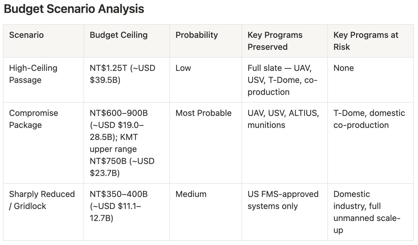 The KMT has not tabled a formal bill but internal caucus discussions indicate a ceiling range of NT$350B–$750B (~USD $11.1–23.7B) — a span wide enough to accommodate either a minimalist blocking position or a genuine compromise with the DPP at a mid-range figure. The upper end of that range would preserve core unmanned programs while deferring integrated air defense and major co-production. The lower end is functionally equivalent to the TPP’s bill.