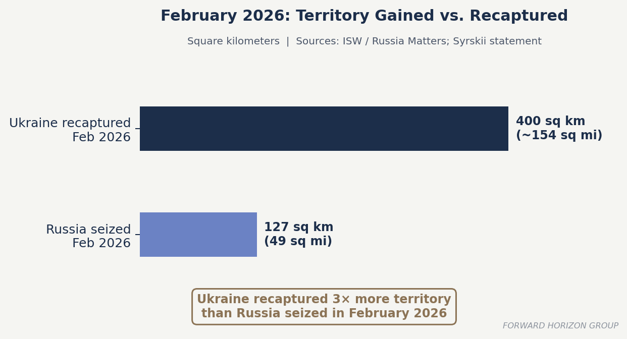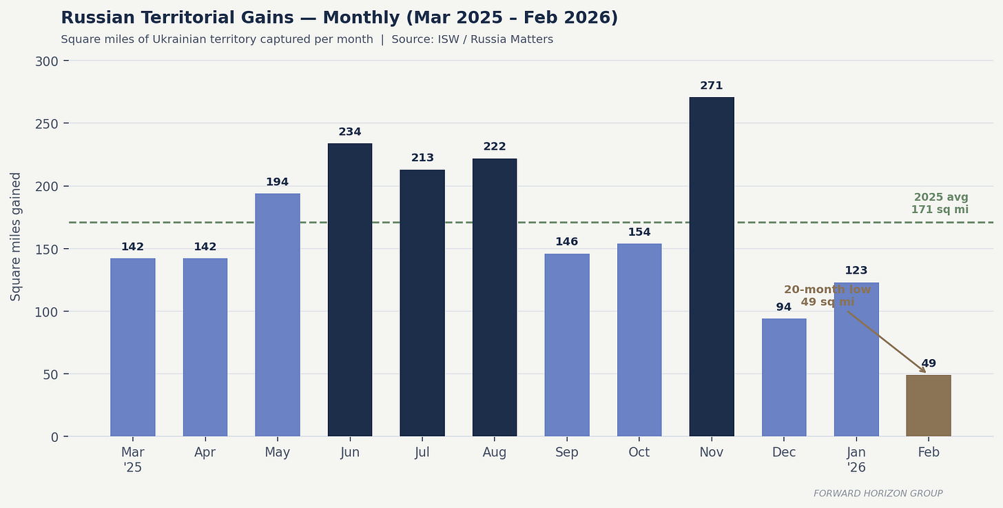 Ukraine’s February counteroffensive in the Zaporizhzhia-Dnipropetrovsk junction produced the most consequential operational result since Kherson: ISW assessed that Ukrainian forces liberated more territory in the final two weeks of February than Russia seized during the same period. Russia’s total February gains — 49 square miles — were the smallest monthly advance since July 2024, less than half of January’s pace. Zelensky and commander-in-chief Syrskii confirmed 300–400 square kilometers recaptured in the south since late January. [HIGH confidence — ISW data, DeepState corroboration]