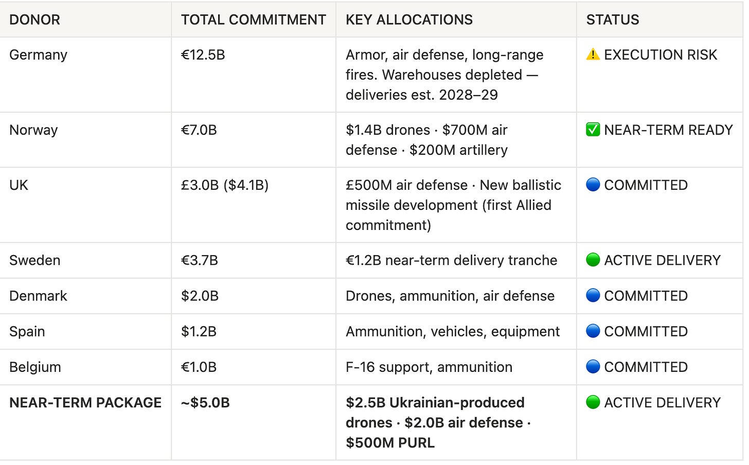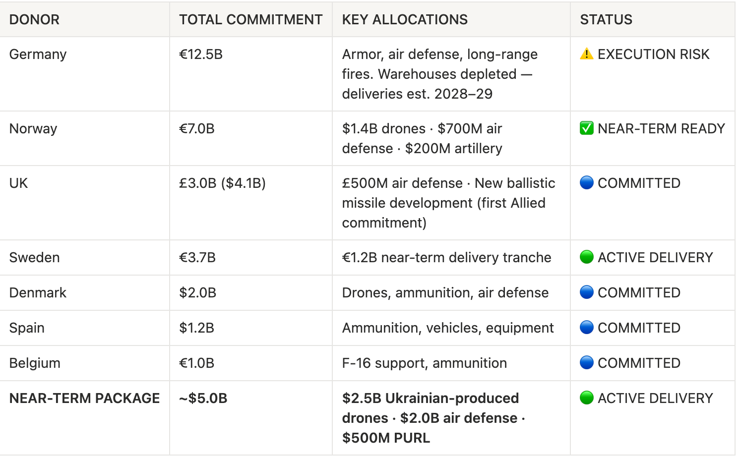 The Ramstein aid architecture from February 12 ($38 billion committed for 2026) remains the structural foundation. The near-term execution risk — German warehouse depletion and 2028–2029 contracted delivery timelines — has not been resolved. Norway’s direct Ukrainian-production purchase model and the PURL mechanism remain the most execution-ready channels.