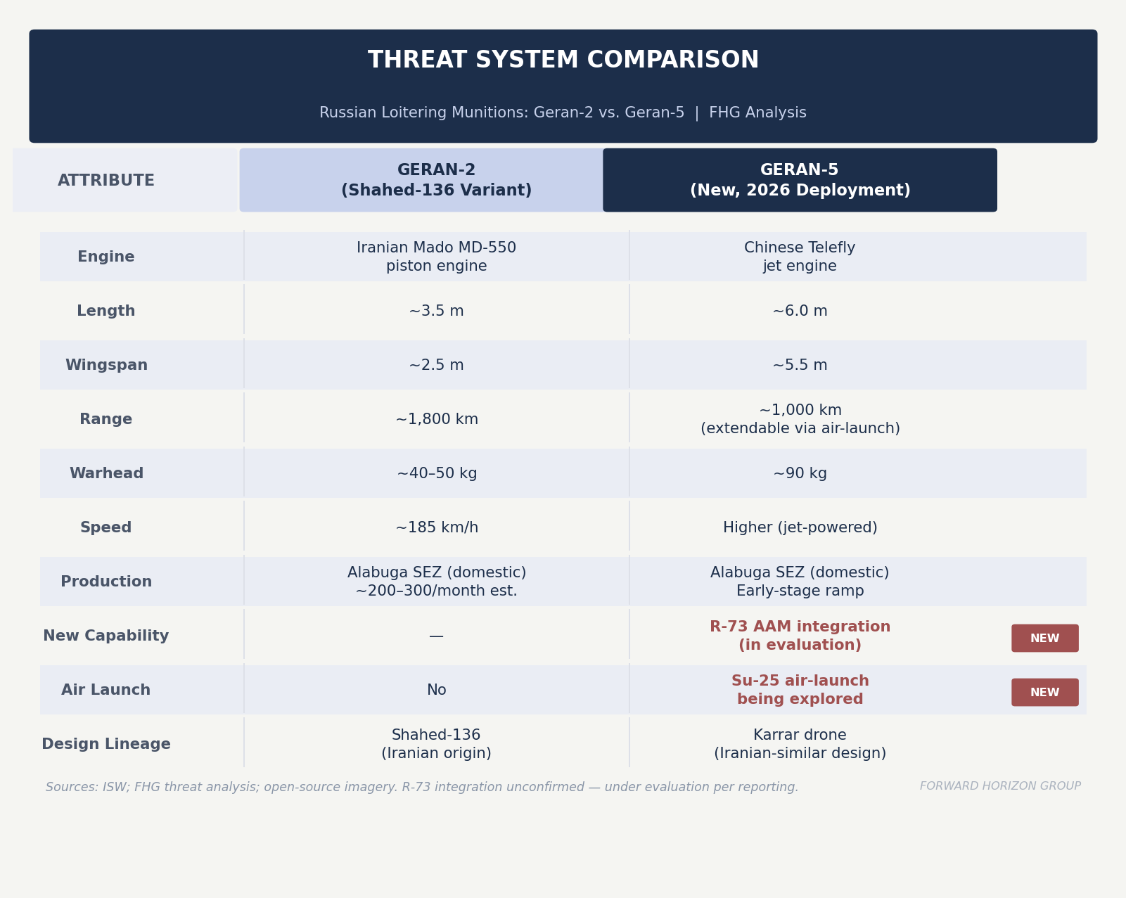 Russia’s Geran-5: the drone threat expands. Russia deployed a new jet-powered drone, the Geran-5, against Ukraine for the first time in early 2026. The drone is approximately 6 meters long with a 5.5-meter wingspan, carries a 90-kilogram warhead, and has a claimed strike range of approximately 1,000 kilometers. Unlike earlier Geran variants derived from Iran’s Shahed airframe, the Geran-5 bears significant design similarities to Iran’s Karrar drone and is powered by a Chinese-made Telefly jet engine. Russian forces are exploring air-launching the Geran-5 from Su-25 attack aircraft to extend effective range, and are evaluating fitting the platform with R-73 air-to-air missiles — a configuration that would turn the drone into a platform capable of engaging air targets.